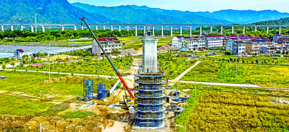 5月6日,在杭温高铁浙江省台州市仙居特大桥施工现场,中铁上海工程局施工人员利用晴好天气加快施工进度。据了解,仙居特大桥是杭温高铁重点控制性工程,桥梁总长4418.33米。陈月明摄(中经视觉)