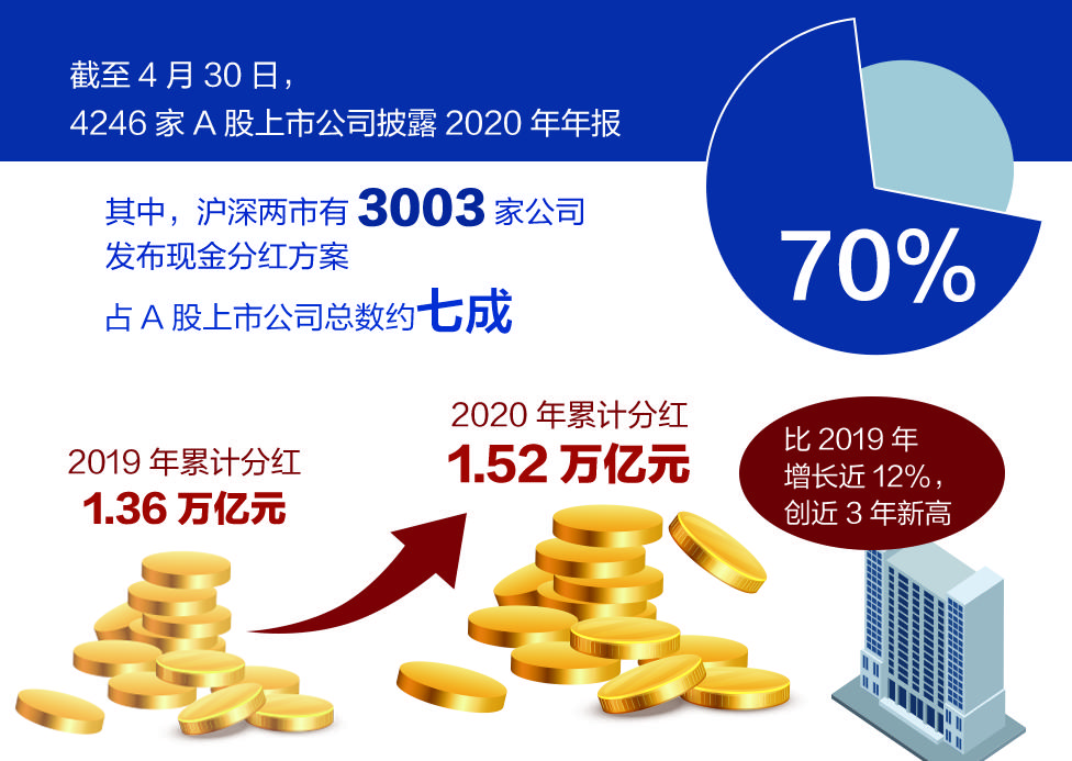 近期,A股上市公司亮出优异答卷,逾七成上市公司在2020年年报中表示将以现金分红方式回报股东。数据显示,截至4月30日,4246家A股上市公司披露2020年年报,营业收入合计53.07万亿元,实现归属母公司股东净利润合计3.98万亿元,同比分别增长2.45%、4.63%。其中,沪深两市有3003家公司发布现金分红方案,占A股上市公司总数约70%,累计分红总额1.52万亿元(含当年季报、半年报、年报分红),相比2019年度的1.36万亿元增长近12%,创近3年新高。