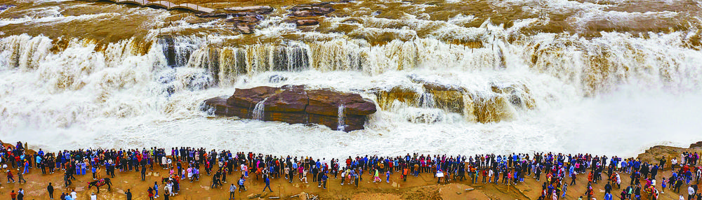 ①游客在临汾市吉县黄河壶口瀑布景区观瀑。随着生态环境不断改善,黄河流域水土流失减少,河水更清澈了。 史港泽摄(中经视觉)
