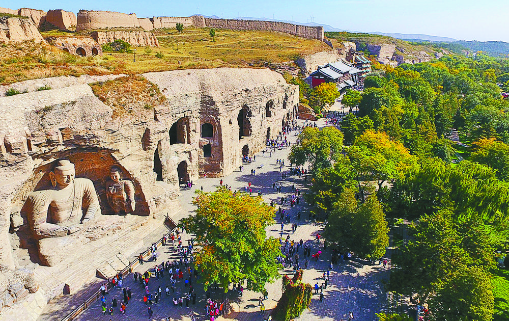 ⑤游客在云冈石窟游览。作为山西旅游的名片之一,云冈石窟凭借巧夺天工的雕刻艺术吸引八方来客。