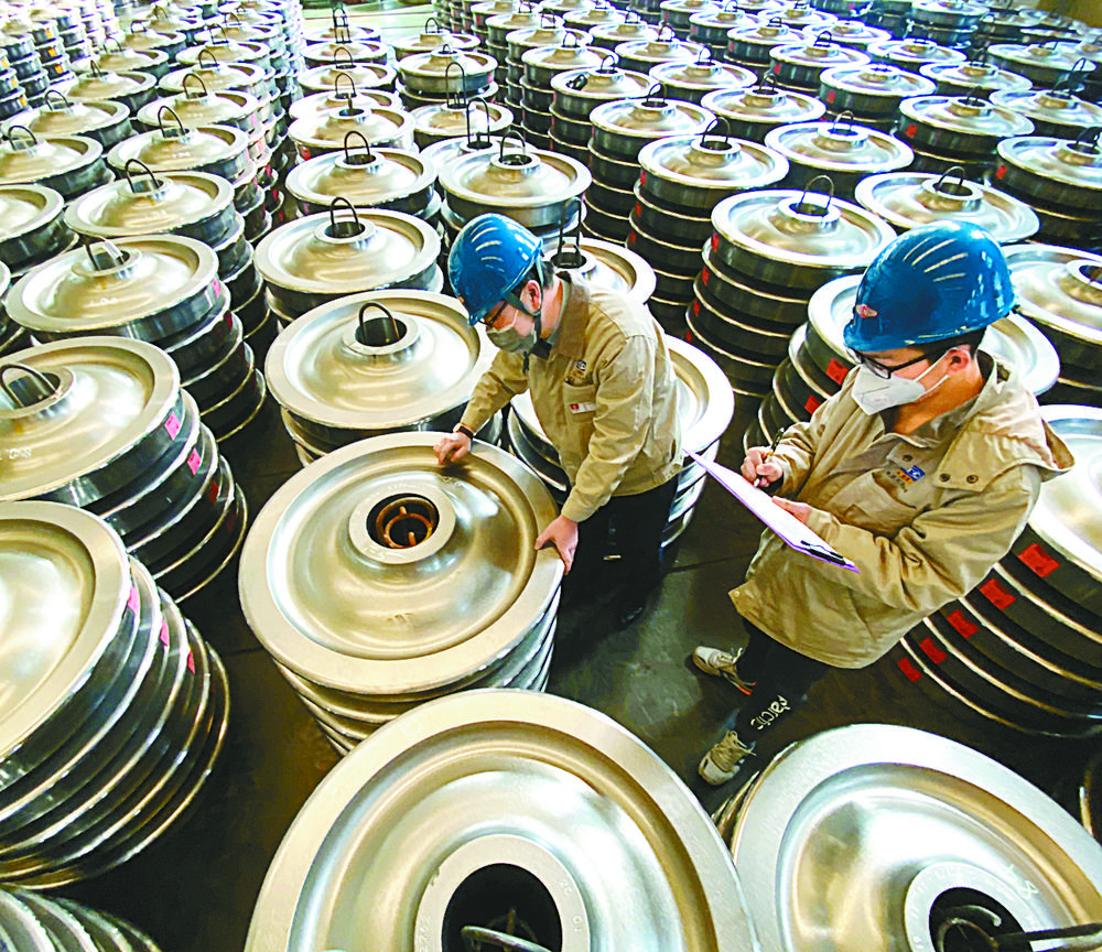 ②太原重工轨道交通设备有限公司,技术人员对发运到欧洲的轨道交通车轮进行查验。 李兆民摄(中经视觉)