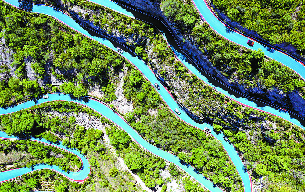 ④车辆行驶在通往太原西山的王封一线天旅游公路上。交通设施的变化有力推动了当地经济的发展。