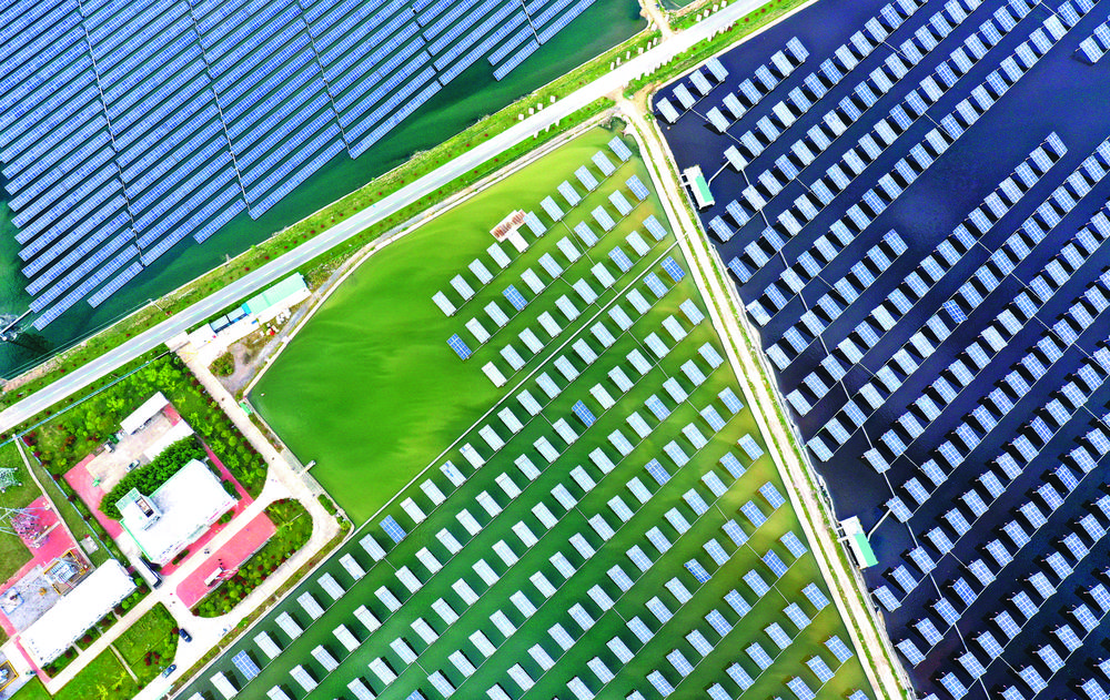 5月12日拍摄的江苏盐城东台沿海“风光渔”互补产业基地。该基地按照集约集聚的开发理念,形成“上有风力发电、中有光伏利用、下有水面养殖”的“风光渔”互补立体开发模式,建成了国内最大的“风光渔”一体化电站,实现滩涂资源高效利用效益最大化,国能、中节能、华电等一批央企国企投资落户。目前,基地新能源装机容量突破1.5GW。