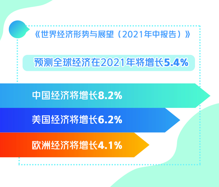 这份题为《世界经济形势与展望(2021年中报告)》预测称,在2020年急剧萎缩3.6%之后,预计全球经济在2021年将增长5.4%。得益于快速的疫苗接种以及持续的财政货币支持政策措施,中国和美国正走上经济复苏之路,这两大经济体的强劲增长前景为上调预测指数提供了支撑。具体来讲,在出口强力复苏和国内需求强劲的支撑下,2021年中国经济将增长8.2%;美国通过迅速接种疫苗、额外财政刺激政策措施和重新开放经济,预计2021年将增长6.2%,这将是美国自1966年以来的最高增长率。