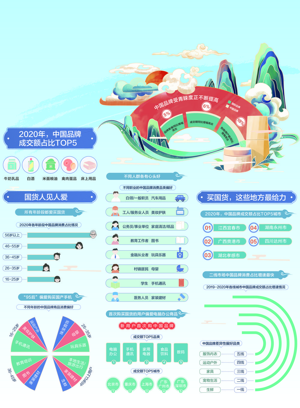 从年龄上来看,不但“银发族”在购物时更加偏好选购中国品牌商品,而且更多年轻人正被越来越有“范儿”的中国品牌所吸引。“95后”年轻群体更爱买国产手机,身为宝爸宝妈的“85后”人群买的最多的是玩具乐器。2020年首次购买中国品牌的用户偏爱电脑办公商品,年轻群体占比更高。