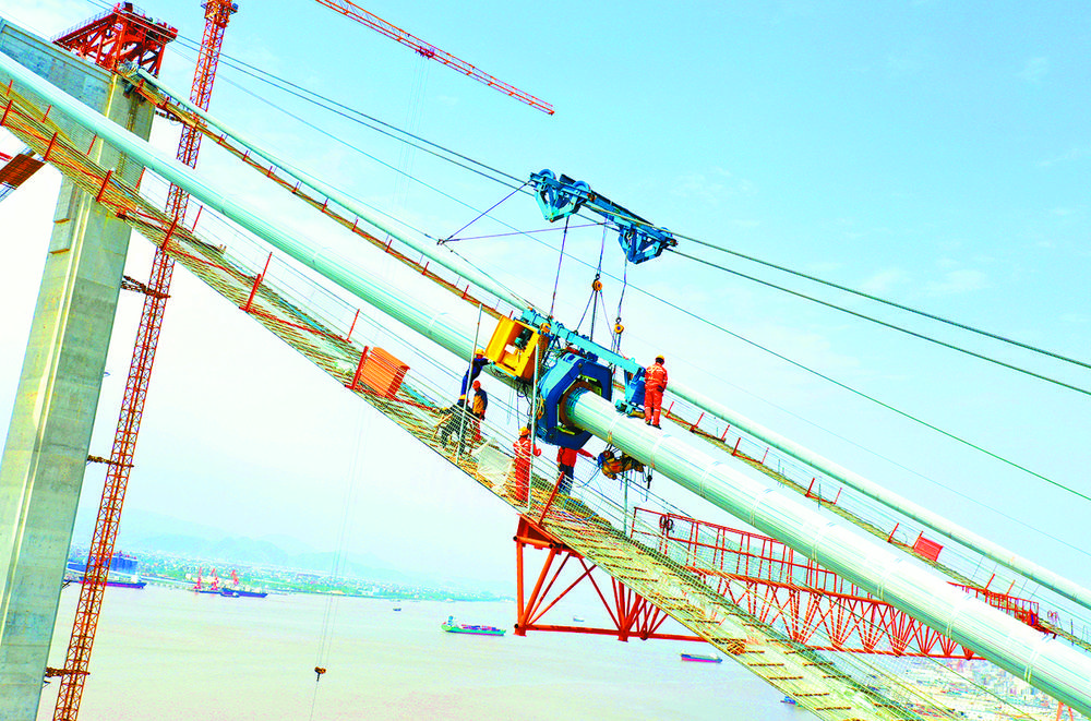 ⑤温州市瓯江北口大桥在加紧施工。该桥是目前世界首座三塔四跨双层钢桁梁悬索桥,计划今年底建成通车。 蔡宽元摄(中经视觉)