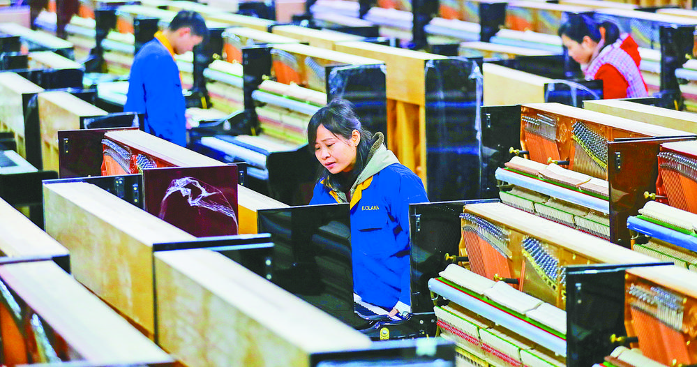 ④位于德清县洛舍镇钢琴小镇产业园的浙江乐韵钢琴有限公司,员工在调试钢琴音色。被称为“中国钢琴之乡”的洛舍镇年产钢琴超过5万架,约占全国总产量的1/7。王 正摄(中经视觉)