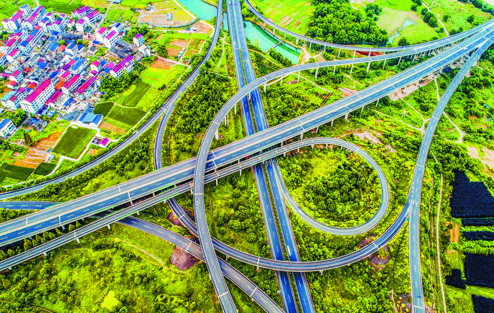 ①仙居县白塔镇诸永、台金高速公路互通枢纽,犹如曲线优美的丝带挥舞在青山绿水间。 陈月明摄(中经视觉)