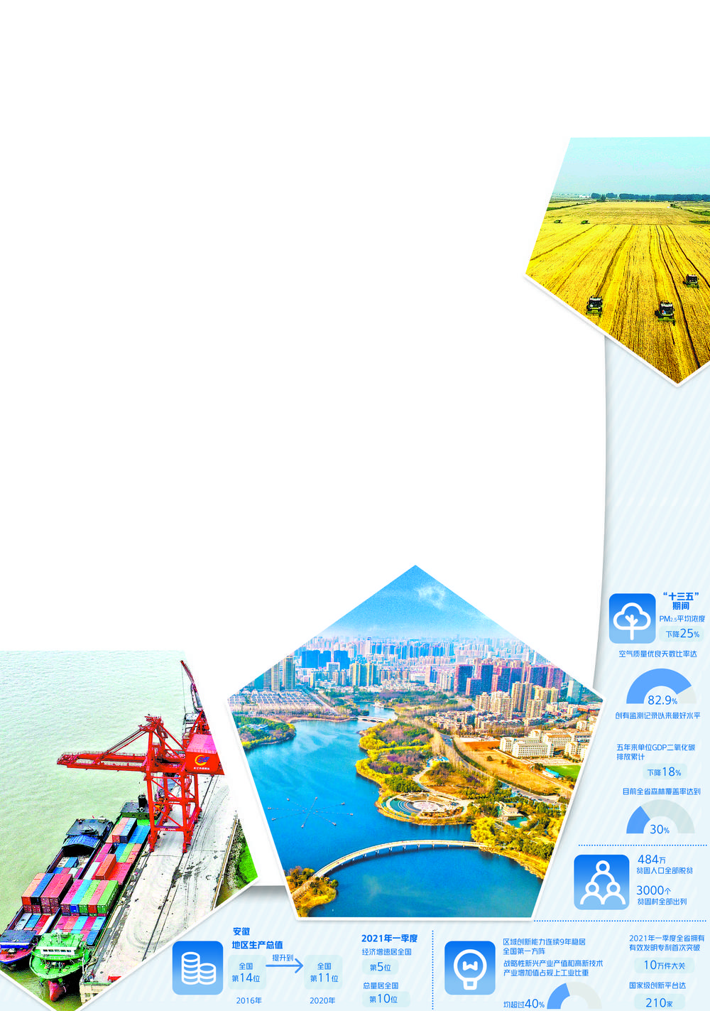安徽是中国革命的重要策源地,是马克思主义在中国传播较早的地区之一。从土地革命时期创建皖西苏区到抗战时期新四军驰骋江淮,从新中国第一炉铜水揭开工业新篇章到小岗村“大包干”拉开农村改革大幕,安徽在中国革命、建设、改革历史长河的每一个断面都留下了深深的印记。在党中央的坚强领导下,安徽人民解放思想、开拓奋进,知重负重、攻坚克难,走过了风云激荡的不平凡历程,取得了令人瞩目的历史性成就。发展能级更高,GDP由2016年全国第14位提升到2020年的第11位,人均GDP从全国第25位提升到第13位,今年一季度经济增速居全国第5位、总量居全国第10位;发展格局更大,长三角一体化发展、“一带一路”、长江经济带、中部地区高质量发展等国家战略叠加覆盖,安徽在全国区域发展中的重要地位前所未有;发展动力更强,区域创新能力连续9年稳居全国第一方阵,战略性新兴产业产值和高新技术产业增加值占规上工业比重均超过40%;发展成色更优,484万贫困人口全部脱贫,3000个贫困村全部出列,31个贫困县全部摘帽,大别山等革命老区、皖北地区和沿淮行蓄洪区区域性整体贫困问题得到历史性解决。