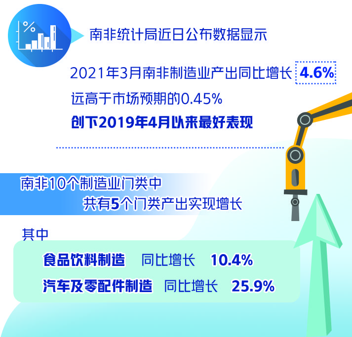 南非统计局近日公布的数据显示,2021年3月份南非制造业产出同比增长4.6%,远高于市场预期0.45%的增速,创下2019年4月份以来最好表现,表明南非制造业生产加速复苏。