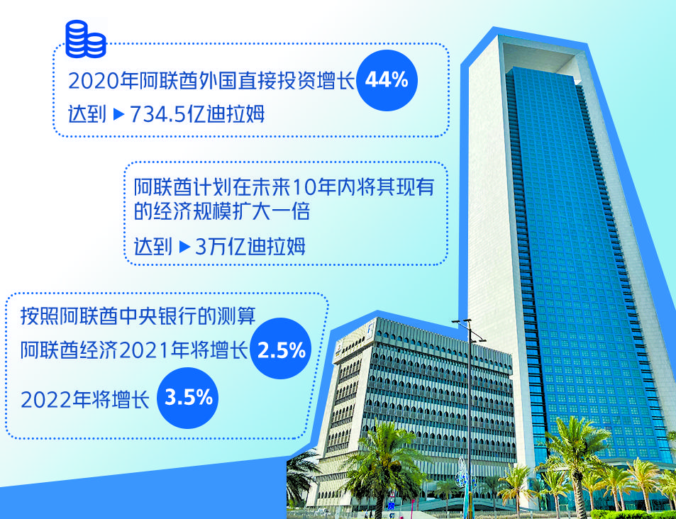 阿联酋政府4月份发布报告称,作为阿金融、交通和贸易中心,迪拜在2020年通过455个项目,总计吸引了247亿迪拉姆(约合68亿美元)的外国直接投资。迪拜投资发展局公布的《迪拜FDI监测》数据显示,2020年迪拜吸引的外国直接投资共为迪拜创造了18325个新的工作岗位。随着外国资金的大量流入,阿联酋计划在未来10年内将其现有的经济规模扩大一倍,达到3万亿迪拉姆(约合8219亿美元)。按照阿联酋中央银行的测算,阿联酋经济2021年将增长2.5%,其中非石油经济增长3.6%;2022年则有望实现3.5%的经济增长,其中非石油经济增长将升至3.9%。