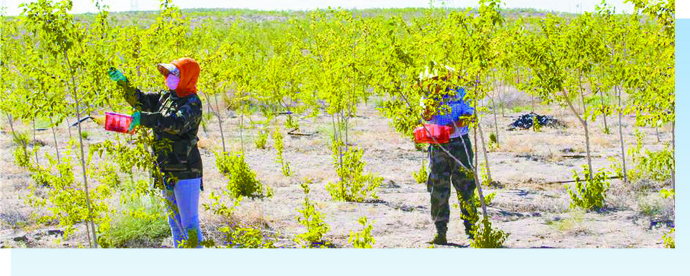 凭借昼夜温差大、光照充足、无霜期长的天然优势,三团生产的薄皮核桃产量高、品质好、绿色有机。“核桃目前亩均收入5200多元,实现了生态效益和经济效益的双赢。”三团农业发展服务中心专业技术人员郭龙告诉记者,近年来,他们加大荒漠化治理和防沙治沙力度,加快南疆沙区特色经济林产业发展。“十三五”期间,南疆师团新增以核桃、苹果为主的经济林逾34万亩,累计带动上万人就业。