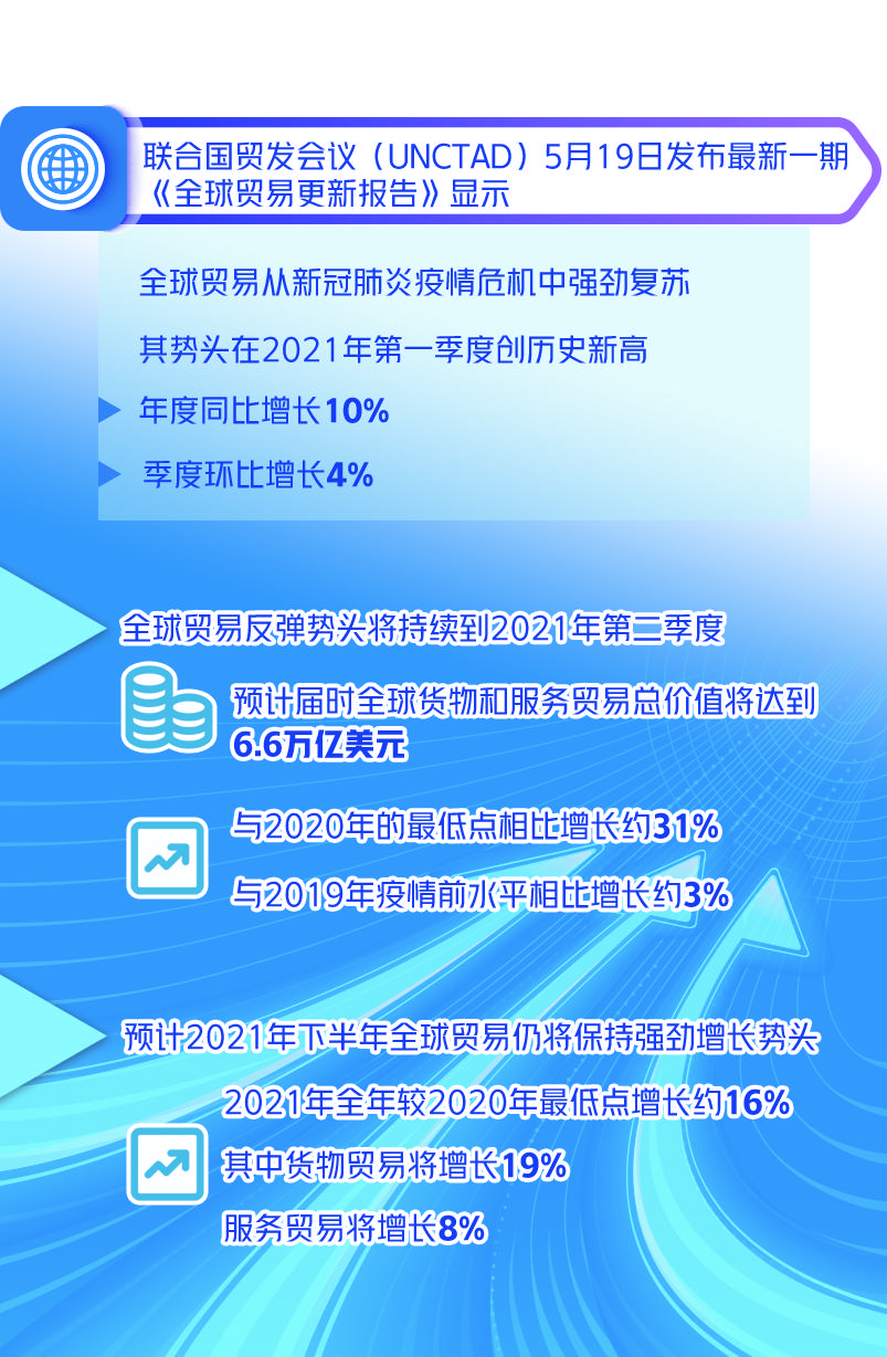 5月19日,联合国贸发会议(UNCTAD)发布最新一期《全球贸易更新报告》显示,全球贸易从新冠肺炎疫情危机中强劲复苏,其势头在2021年第一季度创历史新高,年度同比增长10%,季度环比增长4%;当前全球贸易的反弹势头在很大程度上继续得益于货物贸易的推动,相比之下服务贸易继续滞后。