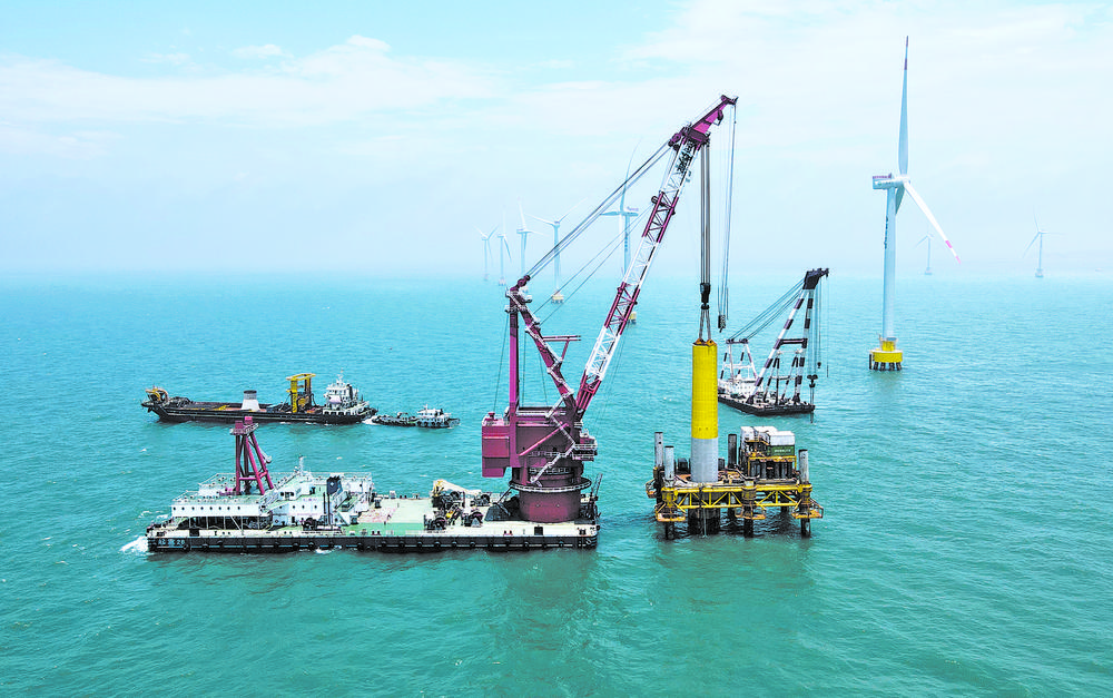 5月21日,中交一航局海上施工人员在进行海上风电大直径嵌岩单桩施工作业(无人机照片)。