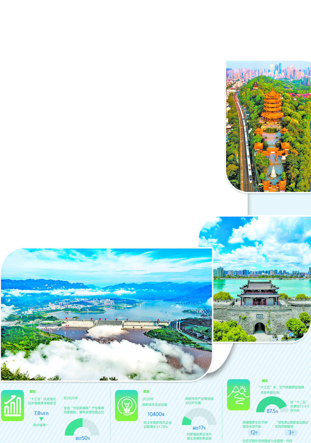 作为老工业基地的湖北,积极贯彻落实新发展理念,坚持高质量发展,在增量和变量上下功夫,在改造传统产业、打造新兴产业上做文章;依托全国前列的科教优势,深入实施创新驱动战略,建设“创新强省”;做好生态修复、环境保护、绿色发展“三篇文章”。
