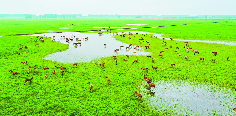 ②长江荆江段,荆州石首麋鹿国家级自然保护区内,人、动物与自然和谐共生。