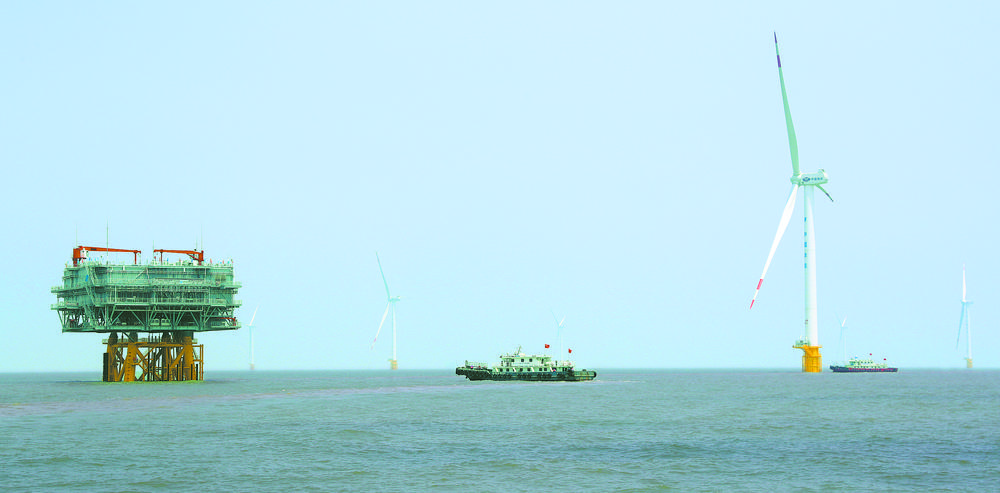 5月24日,华能盛东如东海上风电场建设正在进行,该项目位于江苏省南通市如东县牛角沙海域,计划安装80台风力发电机组,目前已安装72台,预计于6月份并网投产。许丛军摄(中经视觉)
