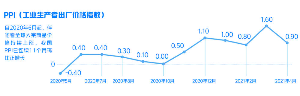 客观而言,受国际大宗商品价格传导以及去年同期低基数等因素影响,近几个月PPI涨幅还将有所扩大,综合考虑翘尾因素和新涨价因素,二季度可能出现全年的高点。展望下半年,随着PPI翘尾影响因素下降,加之主要大宗商品价格走势出现分化,部分品种随着供求匹配度提升而涨幅收敛,PPI新涨价因素与二季度相比将有所回调,预计PPI同比涨幅可能有所收窄。综合判断,此轮PPI涨幅回升是阶段性、暂时性的,全年将呈现“两头低、中间高”的走势,同比涨幅在下半年将有所回落。
