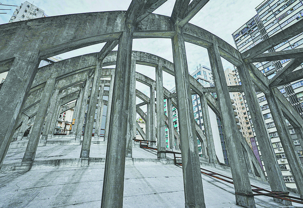 落成于1952年的皇都戏院,是香港硕果仅存、历史最悠久的大戏院,也是当年领一时风气之先的艺术文化地标。图为香港皇都戏院楼顶上的抛物线型大型飞拱建筑设计。 新华社记者 吕小炜摄