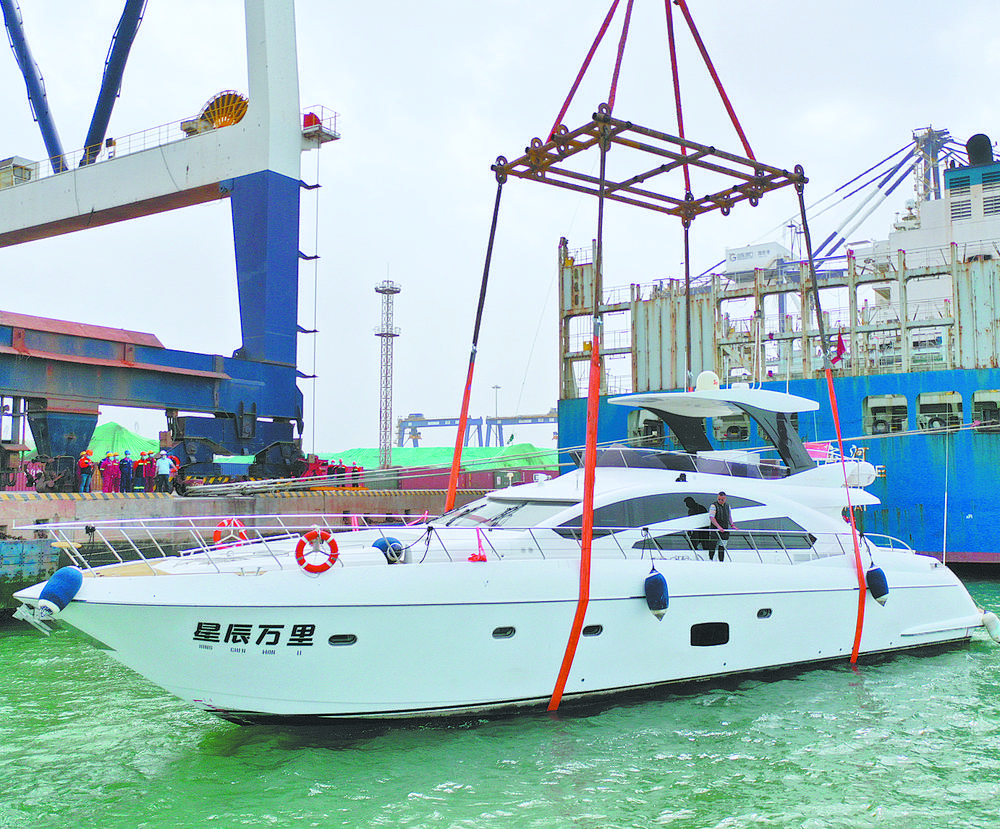 5月24日,一艘长23.8米、宽5.85米、高9米、净重53吨的大型豪华游艇在山东烟台港卸船入海,创该港吊卸游艇单件重量和单件体积最大纪录。近年来,山东烟台港不断完善航线布局,集公、铁、水多种运输方式于一体,货源聚集效应明显,吞吐量跃居全国沿海港口第八位。唐 克摄(中经视觉)