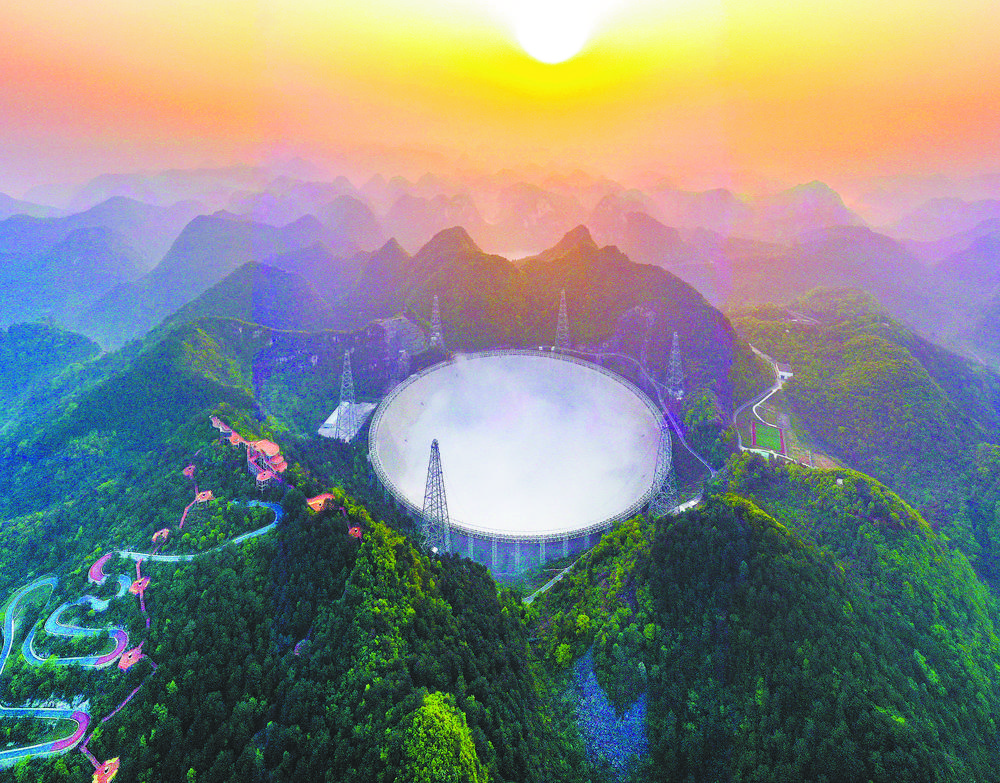 ①位于贵州黔南州的“中国天眼”全景。2021年3月31日0时起,500米口径球面射电望远镜(FAST)向全球天文学家征集观测申请。“中国天眼”是目前世界上最大、最灵敏的单口径射电望远镜,能够接收到100多亿光年以外的电磁信号。 欧东衢摄(新华社)