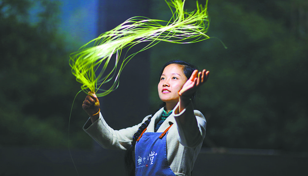 ②贵州省级非物质文化遗产“赤水竹编”传承人杨昌芹在展示细如毛发的竹丝。依托丰富的非遗资源,贵州大力推动传统产业的振兴,促进非遗与文化产业共生共长。