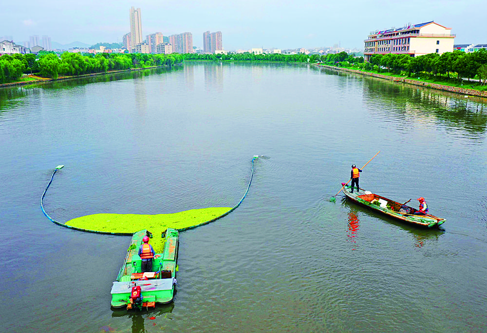 5月30日,浙江省温岭市金清大港新河段,河道保洁员在用自动清理船围捕打捞浮萍等漂浮物。近年来,温岭市在河道保洁中加强投入和监督,引进新型浮物清理船等设备,有效提升保洁效果,助力改善水质和生态环境。刘振清摄(中经视觉)