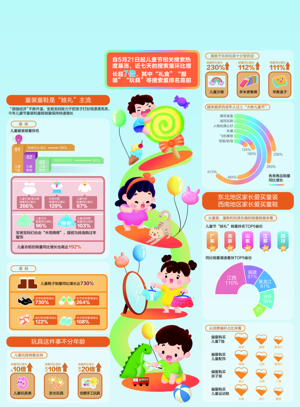 总体来看,随着消费选择越来越多样化,今年“六一”儿童节,宝爸宝妈们表现出高涨的购物热情,儿童消费不断升温。