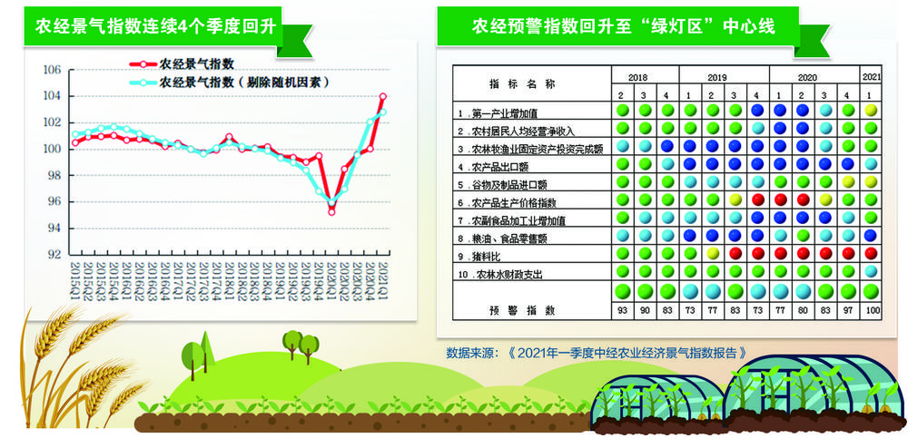 中经农业经济景气监测预警结果显示,一季度,中经农业经济景气指数(以下简称农经景气指数)为104.0,比2020年四季度回升4个点,且比2019年同期水平高4.6个点,处于2013年以来最高水平。中经农业经济预警指数(以下简称农经预警指数)为100.0,比上季度上升3.3点,回升至“绿灯区”中心线。