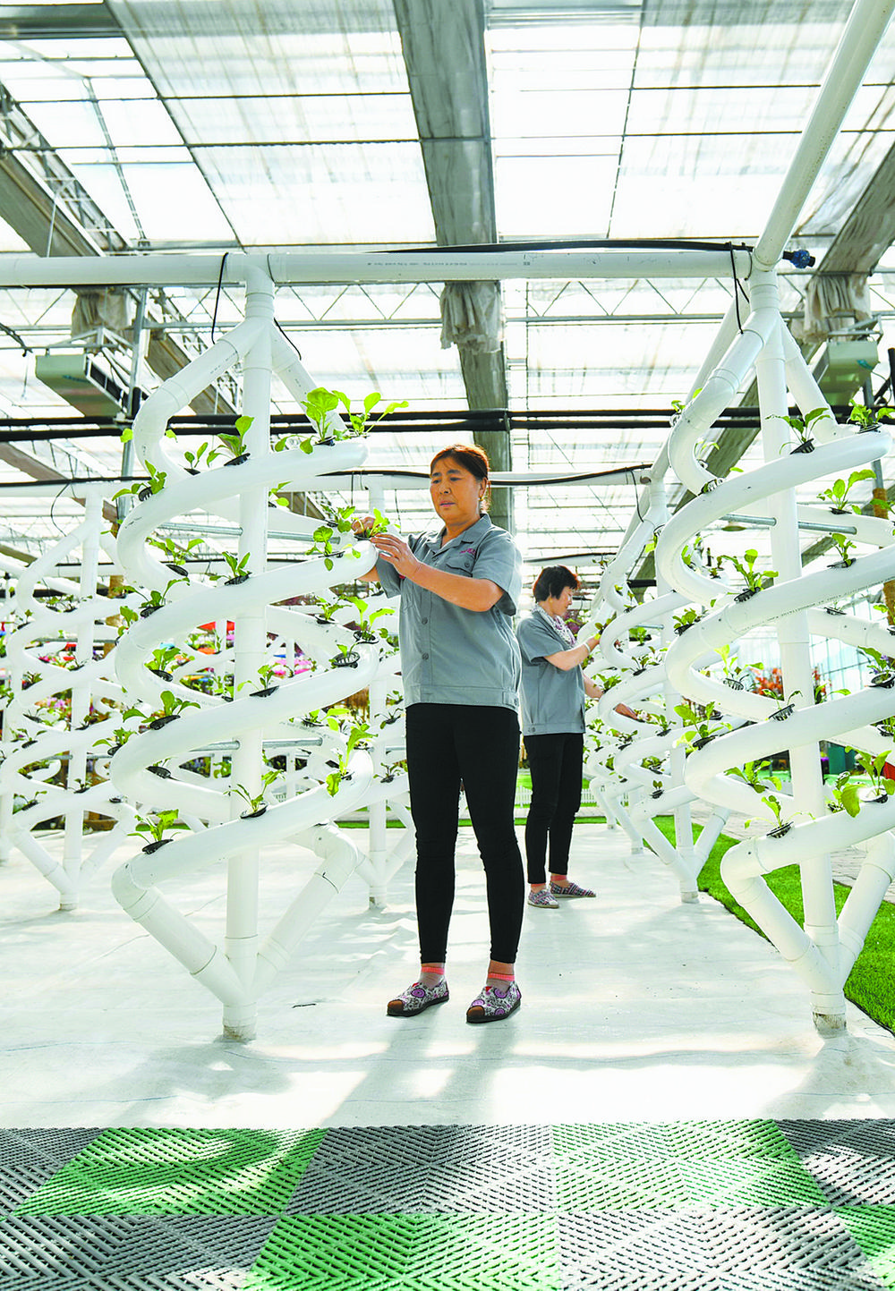 6月3日,在河北省迁西县花乡果巷田园综合体一座智能温室内,工作人员打理无土栽培作物。迁西县依托美丽乡村建设,利用当地自然生态资源,打造以创意农业、农事体验和观光旅游为主要内容的田园综合体,吸纳当地农民就业,为当地农户开拓增收新渠道。新华社记者 牟 宇摄