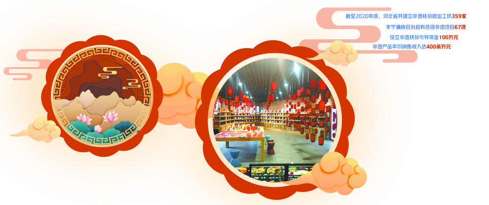 为打造具有丰宁特色的非遗品牌,丰宁鼓励和支持当地传统工艺产品参与各级各类展会和品牌营销活动,并与恭王府、北京故宫文创团队、知名旅游景区景点以及线上线下电商平台深入对接,拓宽非遗扶贫就业工坊生产的传统手工艺产品销售渠道。目前,全县非遗产品年均销售收入达400余万元。