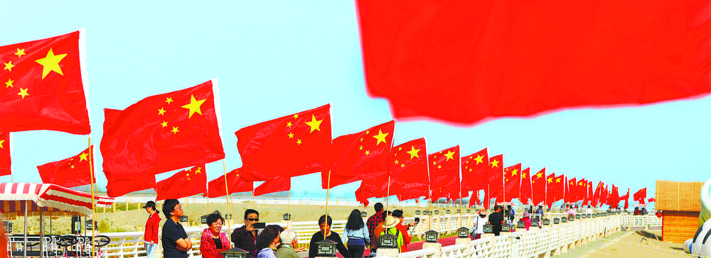 ③博湖县博斯腾湖大河口景区五星红旗将景区装扮得喜庆吉祥。当地不断提升旅游的吸引力和竞争力,让农牧民在家门口“吃上旅游饭,挣上旅游钱”。 年 磊摄(中经视觉)