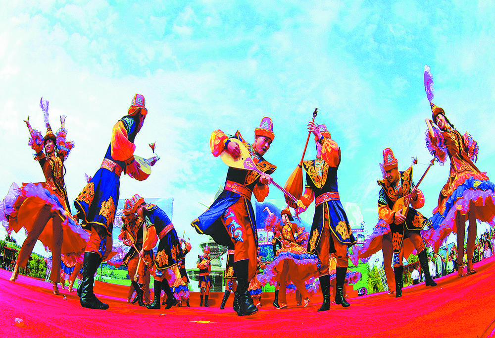 ④库尔勒市绿树绕城,生态宜人。近年来,库尔勒市坚持“生态立市”战略,全力构筑孔雀河源头生态屏障,促进绿色发展。 确·胡热摄(中经视觉) ⑤阿肯阿依特斯是哈萨克族广泛流传的一种艺术形式。这是新疆哈萨克族群众在进行汇演。 刘龙水摄(中经视觉)