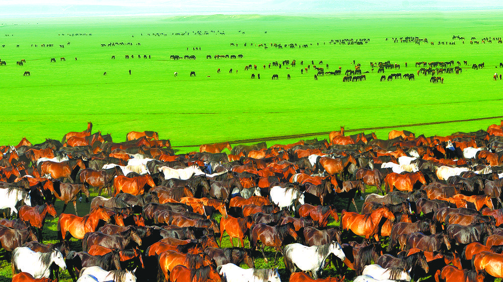 ①万马奔腾在伊犁哈萨克自治州昭苏县天马文化园。当地依托地域优势,大力发展旅游业。