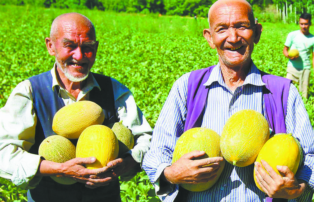 ②库车市玉奇吾斯塘乡兰干村农民正在采摘哈密瓜。近年来,库车市调整农业产业结构,引导农民种植特色果蔬,促进增收。 尼亚孜·热合曼摄(中经视觉)