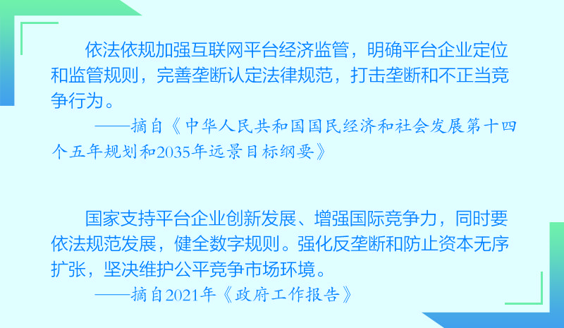 前不久召开的中共中央政治局会议强调,“要加强和改进平台经济监管,促进公平竞争”。中央财经委员会第九次会议明确指出,“坚持发展和规范并重,把握平台经济发展规律,建立健全平台经济治理体系,明确规则,划清底线,加强监管,规范秩序,更好统筹发展和安全、国内和国际,促进公平竞争,反对垄断,防止资本无序扩张”。去年底召开的中央经济工作会议将“强化反垄断和防止资本无序扩张”作为2021年要抓好的重点任务之一,要求健全数字规则,完善平台企业垄断认定等方面的法律规范,加强规制,提升监管能力,坚决反对垄断行为。