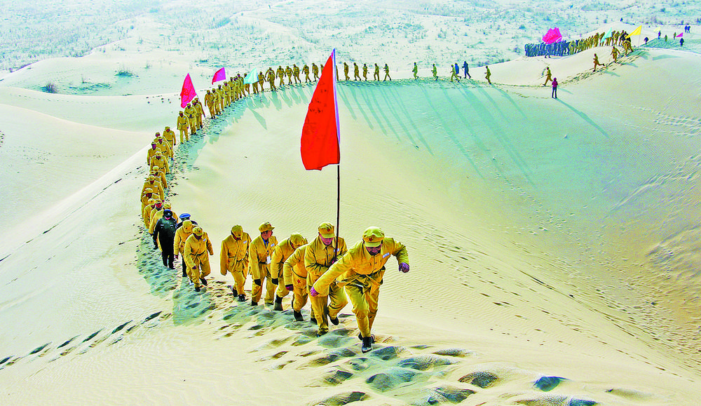 ③十四师民兵在体验沙漠行军的途中。当年,解放军官兵徒步穿越“死亡之海”塔克拉玛干沙漠,解放和田,随后响应号召就地转业,用忠诚、坚守孕育了“扎根新疆、热爱新疆、屯垦戍边”的“老兵精神”。 马春燕摄(中经视觉)