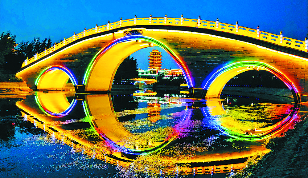④二师铁门关市将军河景观带夜景。铁门关市于2012年12月29日挂牌成立,经过多年建设,已成为一个生态良好、充满生机,宜居宜业宜游的军垦城市。 栗卫平摄(中经视觉)