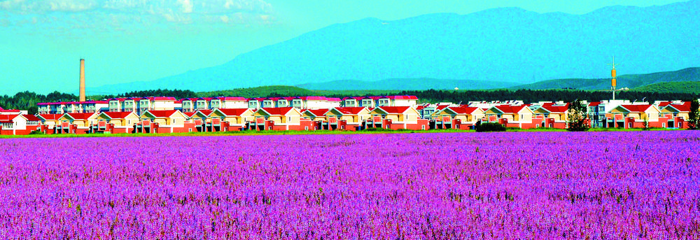 ⑤兵团四师七十七团小城镇掩映在一片花海之中。自国家实施保障性住房政策以来,兵团累计建设保障性住房60余万套,实施棚户区改造40余万户,150余万职工群众喜迁新居。 王德江摄(中经视觉)