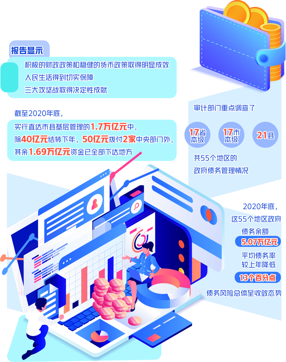 对于公众比较关注的政府债务风险问题,审计部门重点调查了17省本级、17市本级和21县共55个地区的政府债务管理情况。报告显示,2020年底,这55个地区政府债务余额5.07万亿元,平均债务率较上年降低13个百分点,债务风险总体呈收敛态势。
