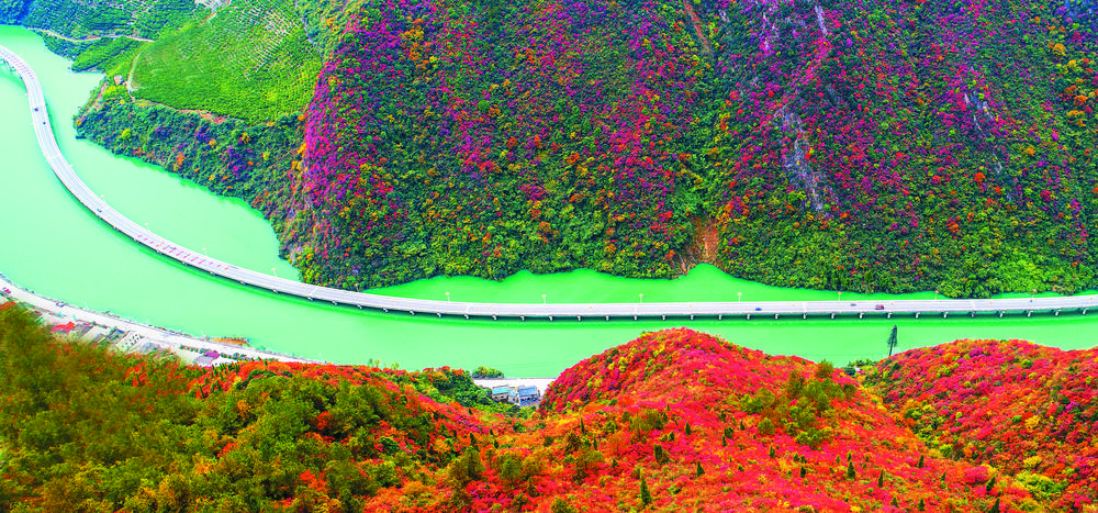 ①湖北省宜昌市兴山县水上生态公路如一条玉带环绕在青山绿水间。高速公路在中国大地上连点成线、织线成网,形成了资源互通、机遇共享、优势互补的发展网。袁选国摄(中经视觉)