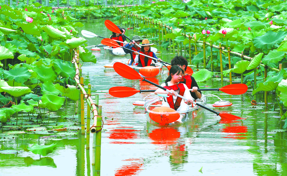 6月12日,浙江省德清县下渚湖国家湿地公园荷花盛开,吸引了众多游客前来游玩观赏。