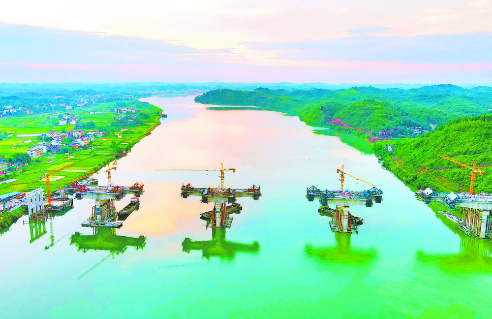 6月13日,横跨湘江的常祁高速公路石潭湘江特大桥正在加紧施工。常祁高速公路主线长约32公里,投资总概算33.29亿元,预计2021年底建成通车。