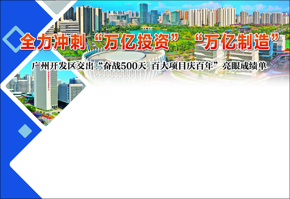 2021年6月18日上午,广州开发区举行“百大项目庆百年”大会战发布会,亮出“奋战500天,百大项目庆百年”成绩单,发布“百大项目庆百年”大会战计划和“一十百千万”工程,即:一个引领(党建引领)、十大领域、五百个项目、超千亿年度投资、超万亿计划总投资。