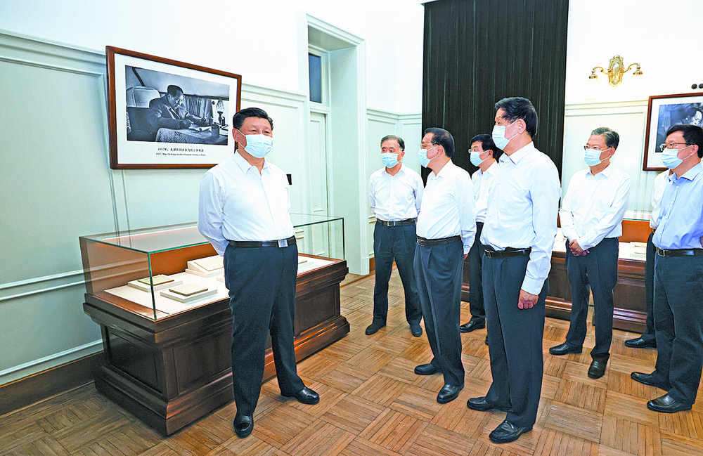 丰泽园毛泽东同志故居,是毛泽东同志从1949年9月21日开始工作和生活了17年的地方。毛泽东同志在这里筹划了新中国建立和建设的一系列大政方略。习近平带领中央政治局同志来到这里参观瞻仰,察看颐年堂大厅现场展陈,观看毛泽东同志在丰泽园工作生活的影像短片,回顾毛泽东同志在这里主持召开的重要会议、作出的重大决策、会见的重要外宾,参观毛泽东同志办公区、会议室和藏书室,仔细察看毛泽东同志批改过的重要文件、阅读过的书籍、穿过的衣物、使用过的日常用品和书信、手稿、照片等,追忆毛泽东同志的卓越功勋和崇高风范。习近平强调,北大红楼和丰泽园在党的历史上都具有标志性意义,生动诠释了中国共产党是怎么来的、中华人民共和国是怎么来的,给我们上了一堂鲜活而又生动的党史课。