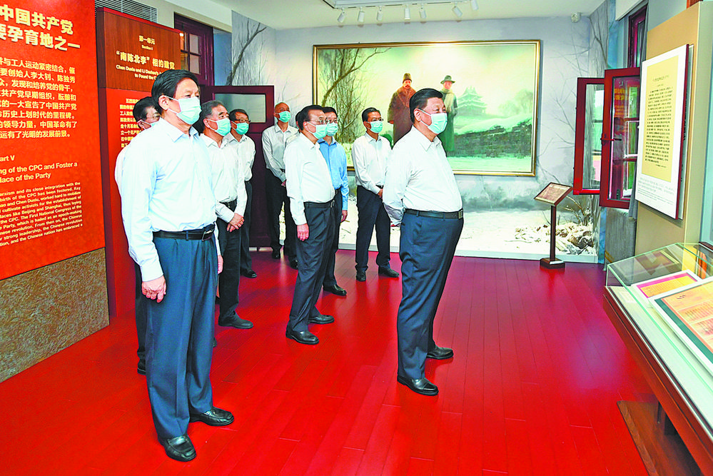 25日下午,习近平带领中央政治局同志来到北大红楼,参观“光辉伟业 红色序章——北大红楼与中国共产党早期北京革命活动主题展”,重温李大钊、陈独秀等开展革命活动、推动马克思主义在中国早期传播、酝酿和筹建中国共产党等革命历史。展厅内,一张张图片、一件件文物,全面展现了那个时期的光辉历史。习近平不时停下脚步,询问相关细节。他指出,北大是新文化运动的中心和五四运动的策源地,最早在我国传播马克思主义思想,也是我们党在北京早期革命活动的历史见证地,在建党过程中具有重要地位。要加强红色资源保护和利用,尊重历史事实,准确评价历史,正确学史用史。