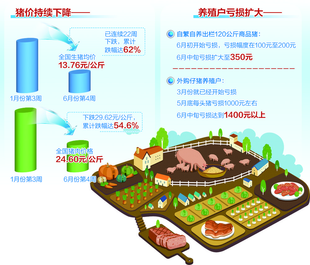 农业农村部对全国500个集贸市场监测数据显示,6月份第4周,全国生猪均价为13.76元/公斤。从1月份第3周的36.01元/公斤起,已连续22周下跌,累计跌幅达62%。6月份第4周,全国猪肉价格为24.60元/公斤,较1月份第3周下跌29.62元/公斤,累计跌幅达54.6%。