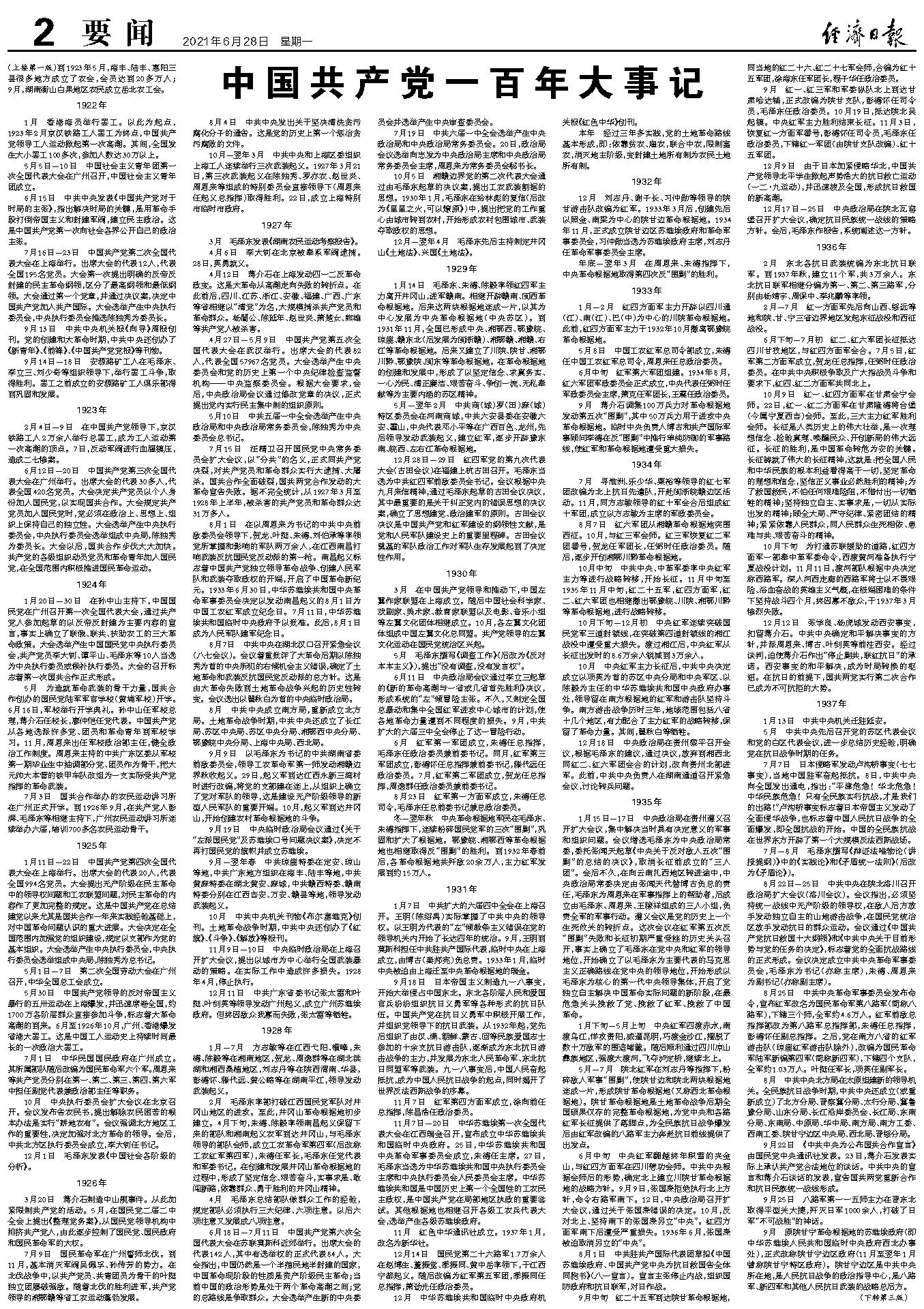 7月23日 中国共产党第一次全国代表大会在上海法租界望志路106号(今兴业路76号)开幕。最后一天的会议转移到浙江嘉兴南湖的游船上举行。参加大会的代表有:上海的李达、李汉俊,北京的张国焘、刘仁静,长沙的毛泽东、何叔衡,武汉的董必武、陈潭秋,济南的王尽美、邓恩铭,广州的陈公博,旅日的周佛海;包惠僧受陈独秀派遣,出席了大会。他们代表全国50多名党员。共产国际代表马林和尼克尔斯基出席了大会。陈独秀和李大钊因事务繁忙未出席大会。大会确定党的名称为“中国共产党”,通过中国共产党的第一个纲领和决议。大会选举产生中央局,陈独秀为中央局书记。党的一大宣告中国共产党正式成立。中国共产党的成立,是近代中国历史发展的必然产物,是中国人民在救亡图存斗争中顽强求索的必然产物,是实现中华民族伟大复兴的必然产物。中国共产党作为中国最先进的阶级——工人阶级的政党,不仅代表着工人阶级的利益,而且代表着整个中国人民和中华民族的利益。它从一开始就坚持以马克思主义为行动指南,始终把为中国人民谋幸福、为中华民族谋复兴作为初心和使命。中国共产党的成立,是中华民族发展史上开天辟地的大事变,具有伟大而深远的意义。中国共产党的成立,充分展现了开天辟地、敢为人先的首创精神,坚定理想、百折不挠的奋斗精神,立党为公、忠诚为民的奉献精神。这是中国革命精神之源、精神之基、精神之本。1941年6月,《中央关于中国共产党诞生二十周年、抗战四周年纪念指示》将7月1日作为中国共产党成立纪念日。