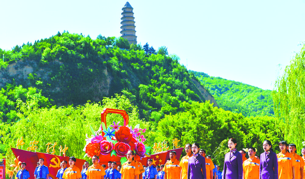 图③ 来自陕西延安铁路系统的百名青年职工在宝塔山下高唱《唱支山歌给党听》《没有共产党就没有新中国》等歌曲。唐振江摄(中经视觉)