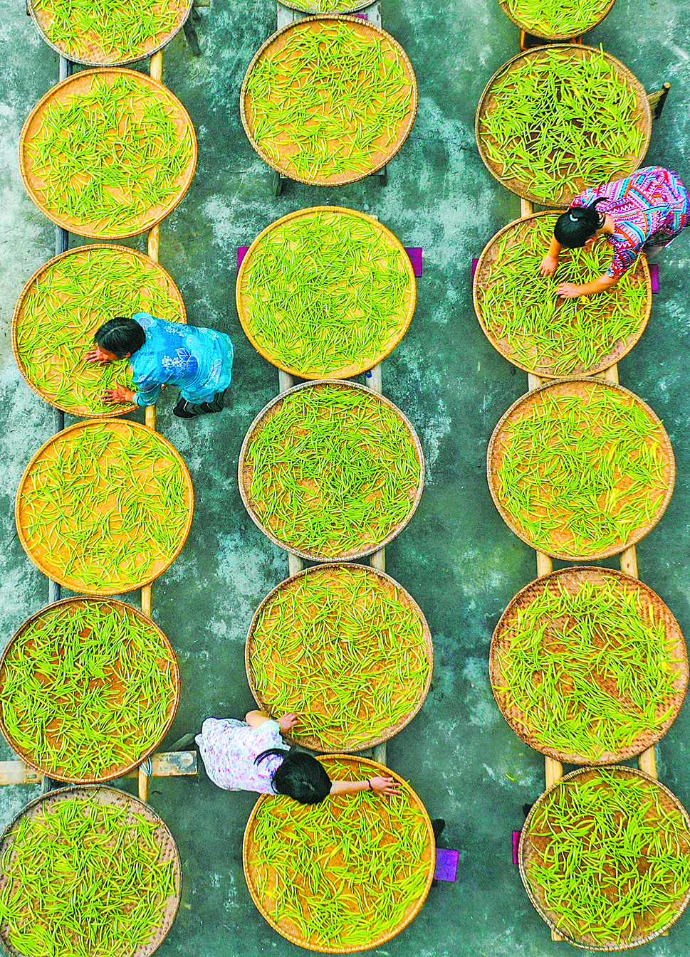 近日,湖南省常宁市洋泉镇西南村村民正在晾晒黄花菜。近年来,当地充分利用地质地域优势,稳步发展壮大黄花菜产业,促进增收致富。周秀鱼春摄(中经视觉)